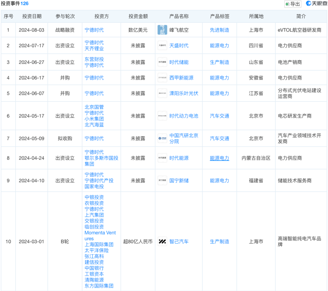 根据天空调查信息,宁德时代近年来发生了126起投资事件。比如2024年,宁德时代投资了EVTOL航空器R&D航空公司峰飞航空,并与小米、BAIC等一起参与电池R&D制造商时代动力电池的设立。,并与多家机构一起参与了高端智能纯电动汽车品牌智能汽车的B轮融资。