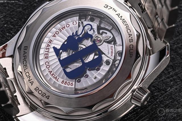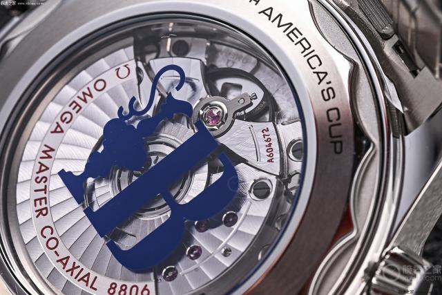 旋转蓝宝石镜面背面,可以清楚地看到“银罐”冠军奖杯的图案和代表巴塞罗那的字母” B “,这些细节无疑增加了这款手表的升值空间。此外,表盘上的激光雕刻波纹图案和中央秒针末端的美洲杯奖牌图案进一步强调了这款手表与帆船比赛的密切关系。