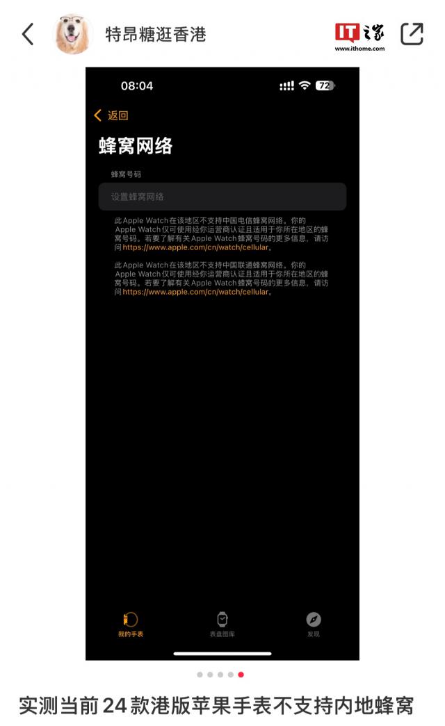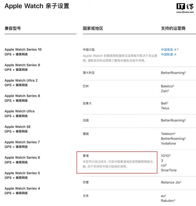IT 世家 9 月 23 日消息,苹果 Apple Watch 根据亲子界面,香港地区型号为“本型号已升级,可在中国香港地区使用蜂窝网络功能,但是不支持在中国大陆地区使用。"