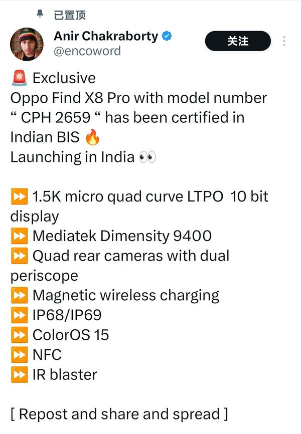 根据国外媒体的消息,一款车型是 CPH2659 新机器已出现在印度。 BIS 在认证平台上,被称为即将推出的认证平台 OPPO Find X8 Pro。这个消息得到了 X 平台客户 Anir Chakraborty 确认,他在他的帖子里分享了这部手机。 BIS 站点截图,并透露更多细节。