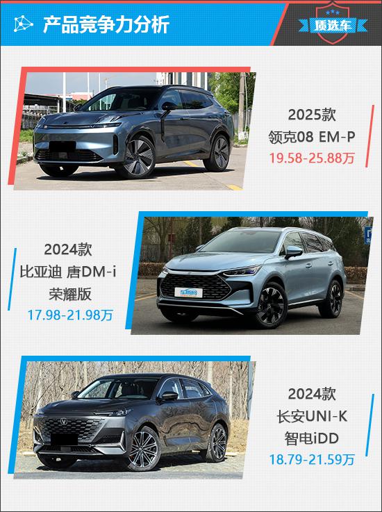 在 20 万级插混中型 SUV 在市场上,领克 08 EM-P 要面对许多强大的竞争者。比亚迪唐 DM-i 荣耀版和长安版 UNI-K 智电 iDD 在这个层面上是比较有代表性的车型。在这些人中,比亚迪更是以“卷王”的称号吸引了更多的关注。这一次,我们将以上两款车型列入竞争对手,看看领克。 08 EM-P 能否应对。