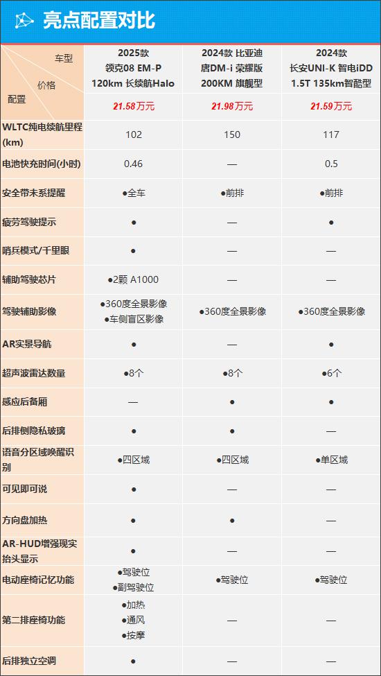 就车辆配置而言,我们选择了尽可能相似的车型进行比较。领克 08 EM-P 配备三款车型的性能更加全面,独享哨兵模式 / 千里眼、AR-HUD 增强现实抬头显示,加热第二排座椅,通风,按摩等功能。相比之下,比亚迪唐 DM-i 荣耀版和长安版 UNI-K 智电 iDD 表现稍差,装备缺失较多。