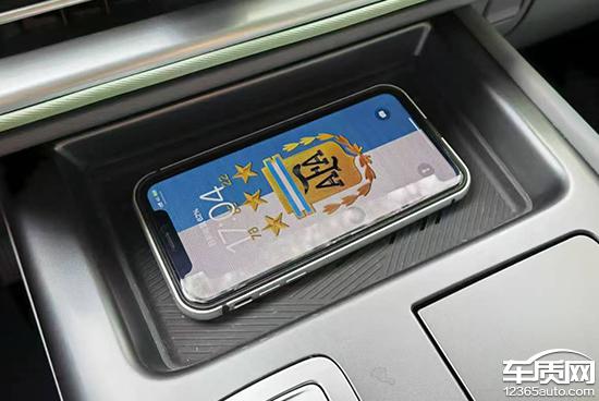 前排中控台下方还配备了评测车。 1 一款手机无线充电板,位置设计合理,方便驾驶员取放手机。充电功率为 50W,并提供通风散热口,详细考虑。