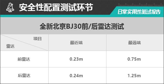 在雷达测试过程中,雷达最远可以在汽车评估之后进行。 1.25m 后雷达的功率表现相当令人满意。根据以往的检测经验,持续蜂鸣阶段越接近 0.25m 而且越接近日常使用习惯,从实测数据来看,后雷达持续蜂鸣阶段的最近距离为 0.24m,接近测试经验。