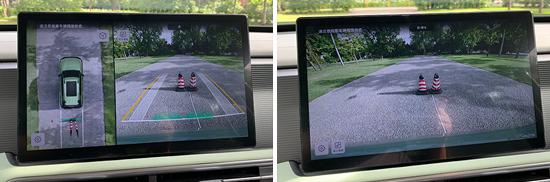 评估车辆的配置 360 全景图像,并提供透明底盘功能,方便驾驶员查看车辆底部道路。图像清晰度好,车辆周围的畸变控制合理,还配有停车辅助线,实用性能符合预期。