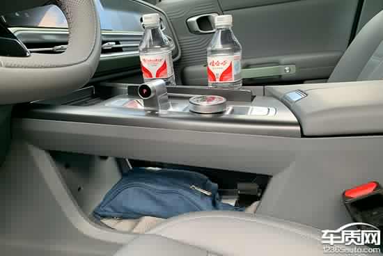 对车内使用空间的检测,仅针对前排触手可及的空间,不包括手套箱、中央扶手箱等需要启动的空间。测试方法是将以下所有固定物品放置在前排的每一个储物空间中,通过固定物品的放置状态来判断车辆储物空间的性能。检验选定的固定物体如下:2 一瓶常规大小的矿泉水, 大屏幕手机,1 支口红、1 个挎包、1 副墨镜、1 把折叠伞和 1 包装常规尺寸的抽纸。