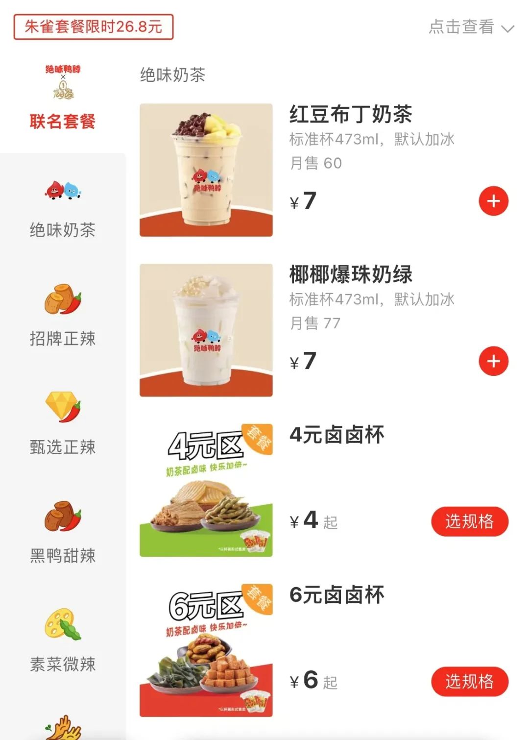 比如在“绝味奶茶”品类下,绝味鸭脖还加入了4元、6元、8元的“卤杯”,口号是“奶茶配卤菜,快乐翻倍”,吸引顾客消费。