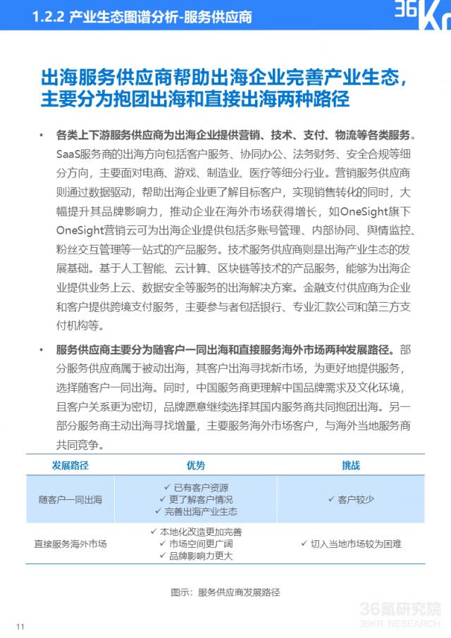 中国海外产业生态系统主要包括海外品牌和各种上下游服务提供商。其中,海外品牌产业的布局逐渐多元化,逐渐从游戏、制造、电子商务等成熟市场拓展到文化娱乐、医药、新技术等跑道。出海方式主要包括跨国并购、投资自建和供应商合作三种方式。从劳动密集型产业向品牌化、智能化、软硬实力等方向转变。各种上下游服务提供商为出海企业提供营销、技术、支付、物流等服务。出海方式包括两条发展路线:和客户一起出海,直接服务国外市场。