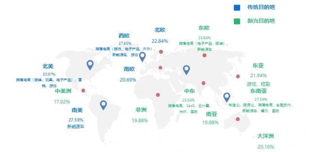 一方面,AI、数字技术如区块链、物联网等全链路赋能企业,覆盖出海前至出海后的各个环节。出海前,帮助企业更好地了解当地消费者的画像,从而选择合适的目的地出海;出海后,赋能企业实现智能制造和跨境供应链稳定,制定个性化营销策略。另外,消费者需求尚未完全开发的新兴市场和仍然存在多元化赛道的发达地区,为中国出海企业提供了广阔的市场空间。其中,新兴市场消费基础好,劳动力成本低,土地成本低,越来越受到海外企业的关注。大象研究院的数据显示,选择东南亚、东欧、中东等新兴发展中国家和地区的海外企业比例接近北美、西欧、南美等海外目的地的比例。