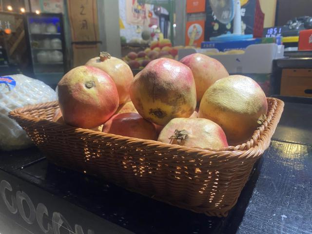 网红果店临街摆放着一篮肥美的大石榴,提醒人们秋天来了。