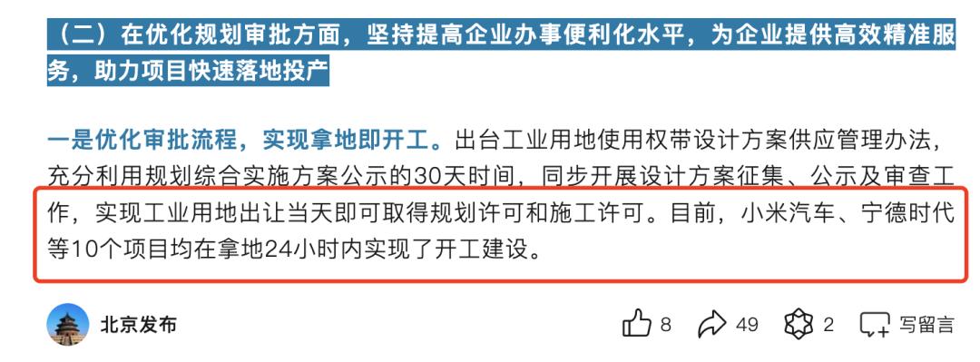 9月19日,北京市委宣传部还在经济开发区专场新闻发布会上介绍,小米汽车、当代安普瑞斯科技有限公司等10个项目在征地24小时内完成建设。