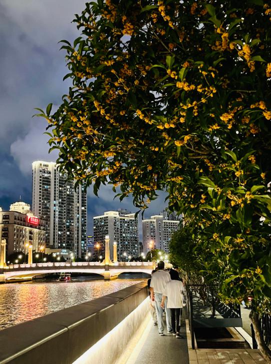今年桂花的步伐比往年珊珊晚了一点。再耐心等等。当桂花香满城时,漫步安静的苏州河亲水步道,肩膀或发梢总会留下难以吹走的香味。