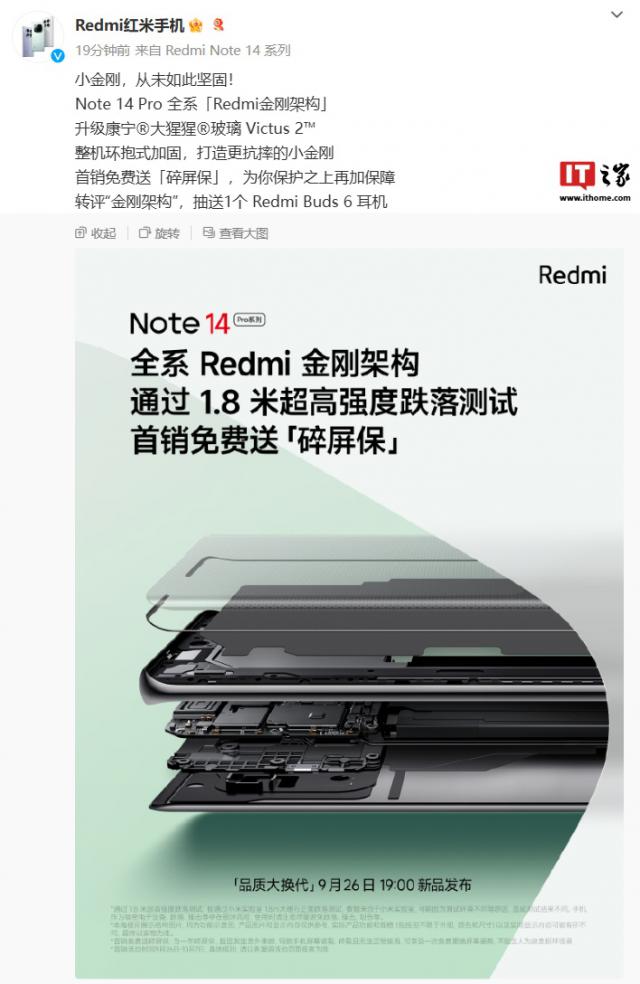 IT 世家 9 月 24 日消息,小米 Redmi Note 14 这一系列手机已经正式确定 9 月 26 日晚 7 点发布,号称“更抗摔、更防水、更长寿命”。