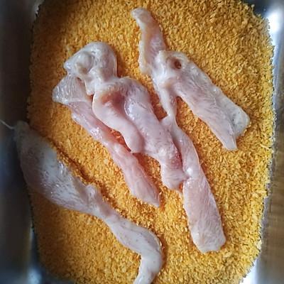2、鸡胸切长条,稍粗一点,洗净,用厨房纸蘸去多余的水份;