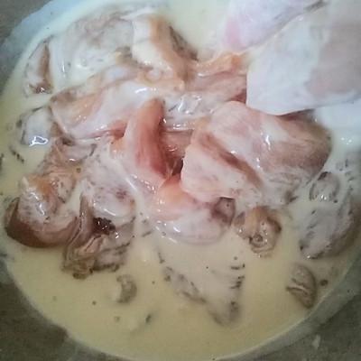 6、将面糊倒入腌制好的鸡柳中,抓匀;