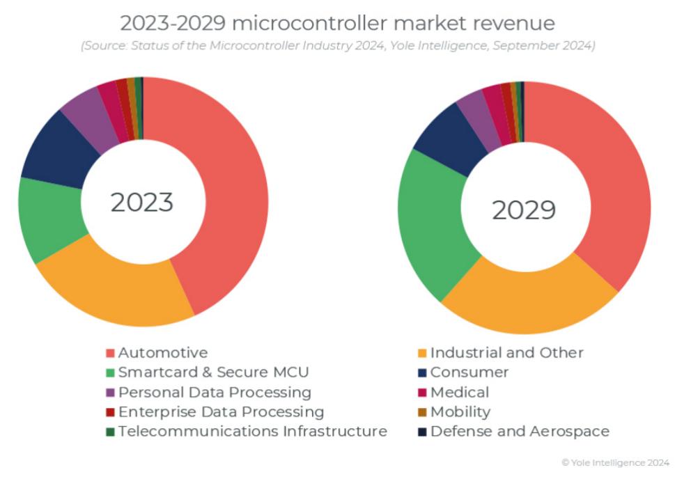 从具体市场来看,2023年全球MCU市场规模为282亿美元,预计到2029年将增长388亿美元,复合增长率为5.5%。汽车和工业仍将是MCU的主要增长市场,而智能卡和安全MCU、未来几年,消费市场将成为一个重要的增量市场,这与边缘AI和AI上车有关。