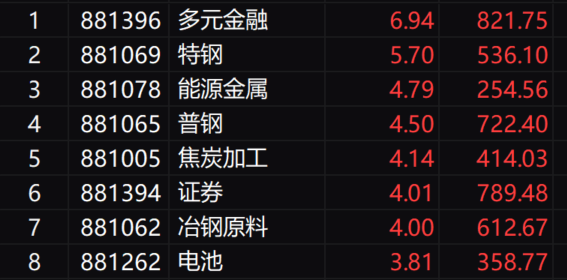 板块方面,多元金融、钢铁、证券、光伏等板块涨幅居前,无下跌板块。
