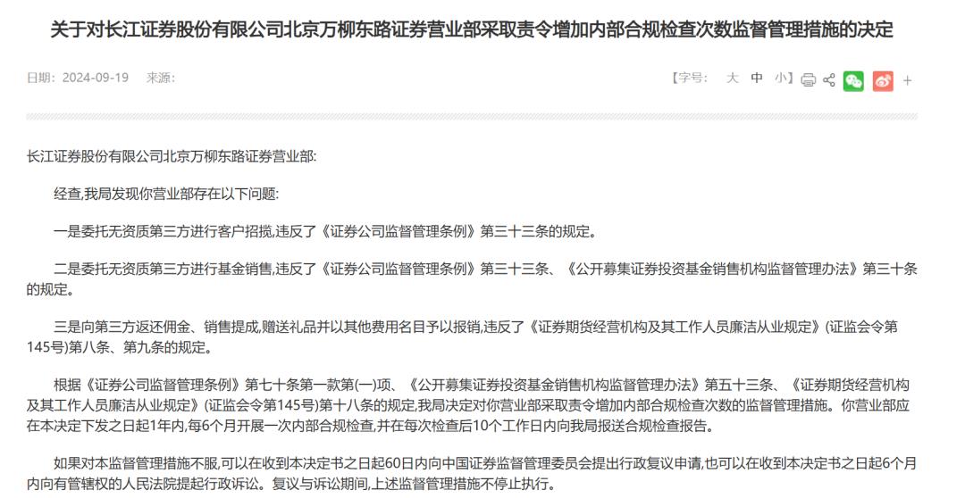 近日,北京证监局对长江证券(000783.SZ)北京万柳东路营业部发放罚单。经调查,营业部委托不合格的第三方吸引客户;委托不合格的第三方销售基金;向第三方退还佣金、销售佣金和赠送礼物,并以其他杂费的名义报销。