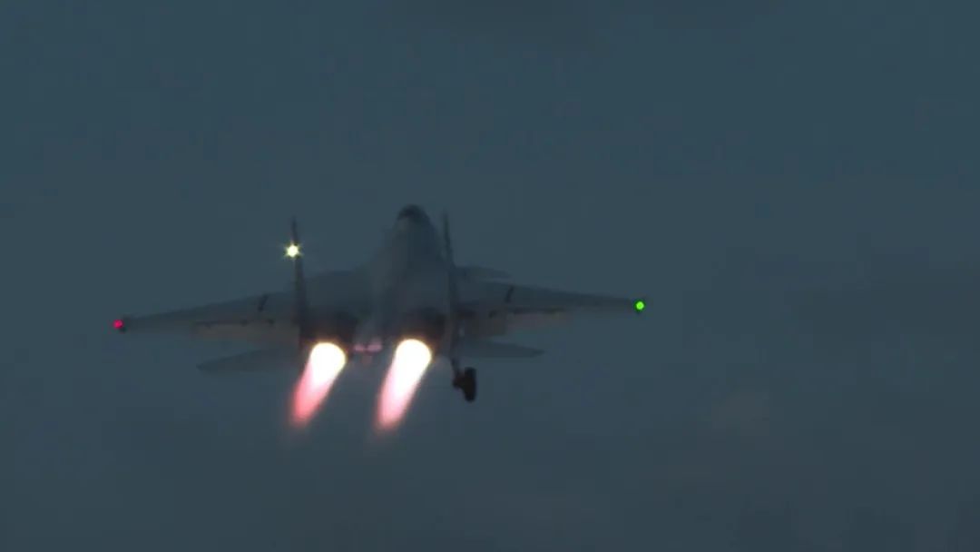 随着起飞助手的手势信号,歼-15战斗机滑动起飞,战斗机的浅蓝色火焰划破夜空。随着高度的不断上升,飞行员只能依靠仪器来判断战斗机的飞行姿势和位置,并立即调整误差。