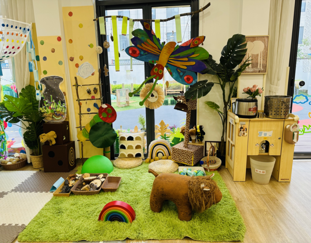 孩子们对“虫子”的兴趣得到了老师们的支持和鼓励。根据绘本《饥饿的毛毛虫》,老师们将绿色长毛绒地毯、巨大的彩色蝴蝶和涂鸦毛毛毛虫等道具组成春季游戏场景,供孩子们互动。