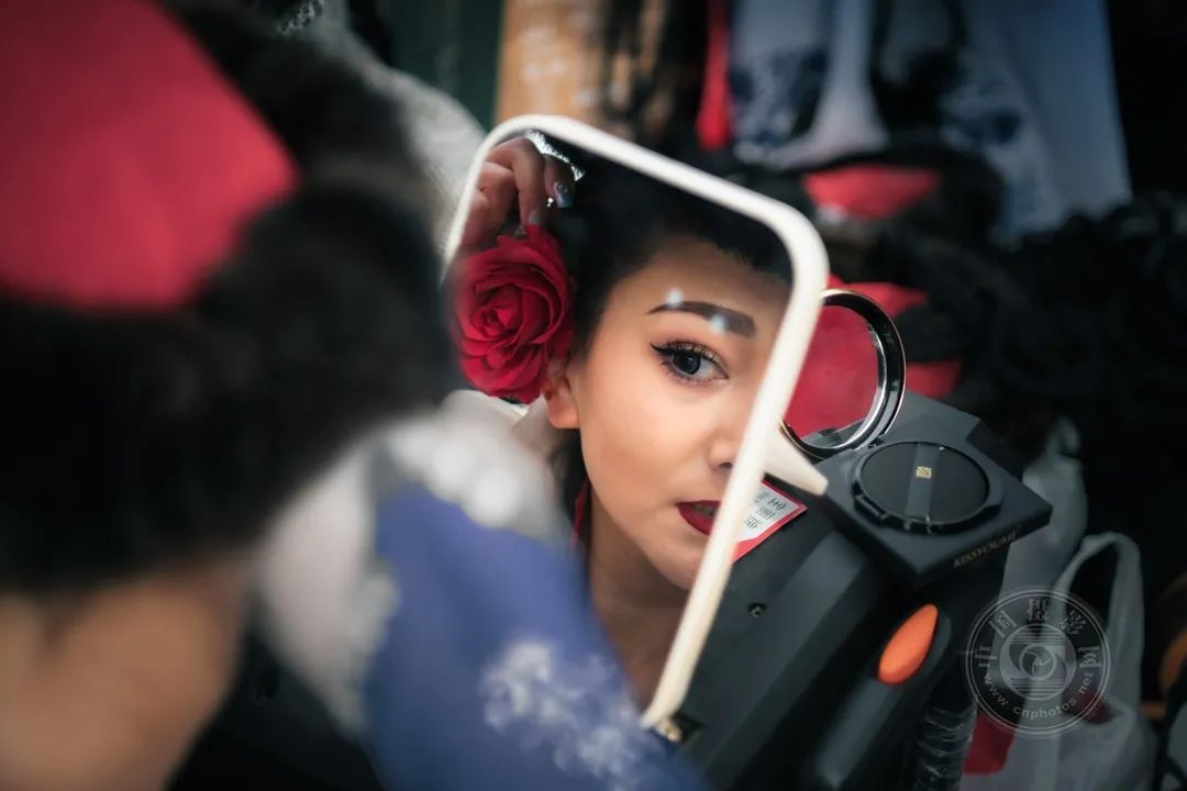 2024年3月15日在河北秦皇岛拍摄,演出前新疆古丽正在化妆。