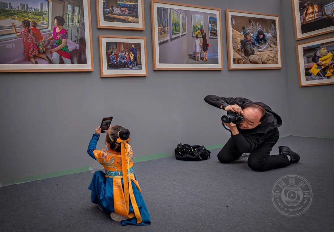 2020年11日21日,在西安市大唐西市第五届丝绸之路影像摄影棚前,一名穿着蒙古族服装的小女孩专注于拍摄展出的照片。另一边,一位老年摄影师被小摄影师的态度所吸引,跪在地上拍摄小摄影师,相互辉映。