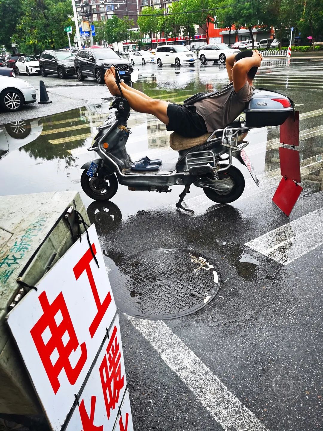沈阳,2024年7月27日。慵懒的劳动者在小雨中午的街角等待着生意的到来。