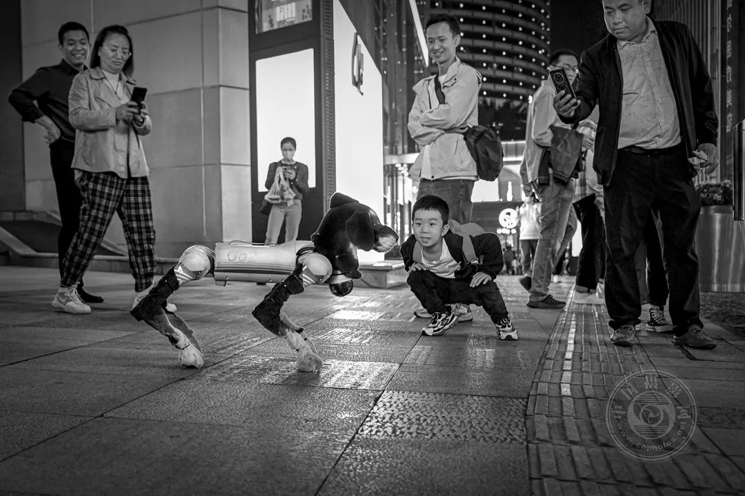2023年11月10日,重庆解放碑商圈。步行街上出现了智能机器宠物狗,吸引了很多路人观看,孩子们奇怪地仔细观看。
