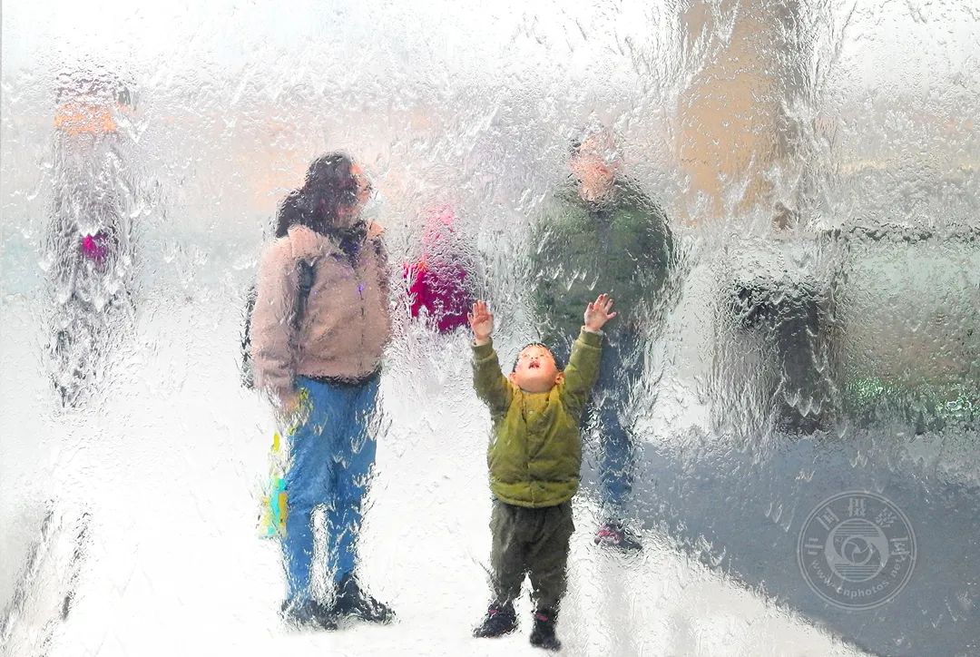 2023年2月13日,四川成都。在成都SKP广场水幕玻璃墙下,一个小男孩好奇地“玩水”,他的父母在后面看。形成明暗,小男孩天真可爱,我赶紧拍了下来。