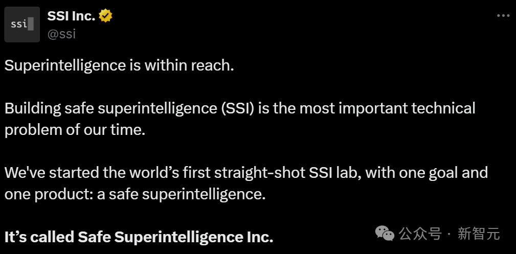 6月份出走创业的Ilya Sutskever,初创公司名为Safe Superintelligence(SSI)。当时他的声明是:「超级智能触手可及」。