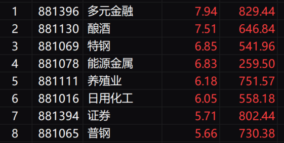 盘面上,大金融股全面爆发,太平洋、首创证券、弘源期货、九鼎投资等10多只股票涨停,东方财富涨幅超过10%。下午白酒股大幅上涨,皇台酒业涨停,贵州茅台涨幅超过8%。钢铁股震荡上涨,中南股份、新钢股份、安阳钢铁、八一钢铁等近10只股票涨停。新能源赛道股反弹,德国纳米、龙盘科技、弘源绿能、TCL中环等涨停。
