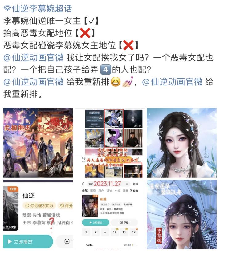 比如2024年的黑马《仙逆》,由于更新作品的介绍,提升了女配柳眉的位置,引起了女主角李慕婉粉丝的维权;比如新一季动画质量明显提升的《朱仙》,因为陆雪琪粉丝和碧瑶粉丝之间谁是女主角,谁只是朋友,谁是亏欠而不断争论;比如《破空》就更不用说了,经常被骂上热搜大多是不平衡好熏儿、美杜莎、小医仙、云韵等几个女性角色的投入…