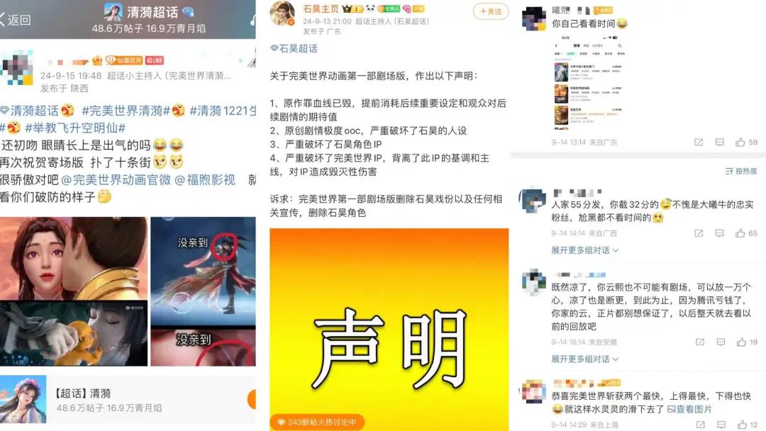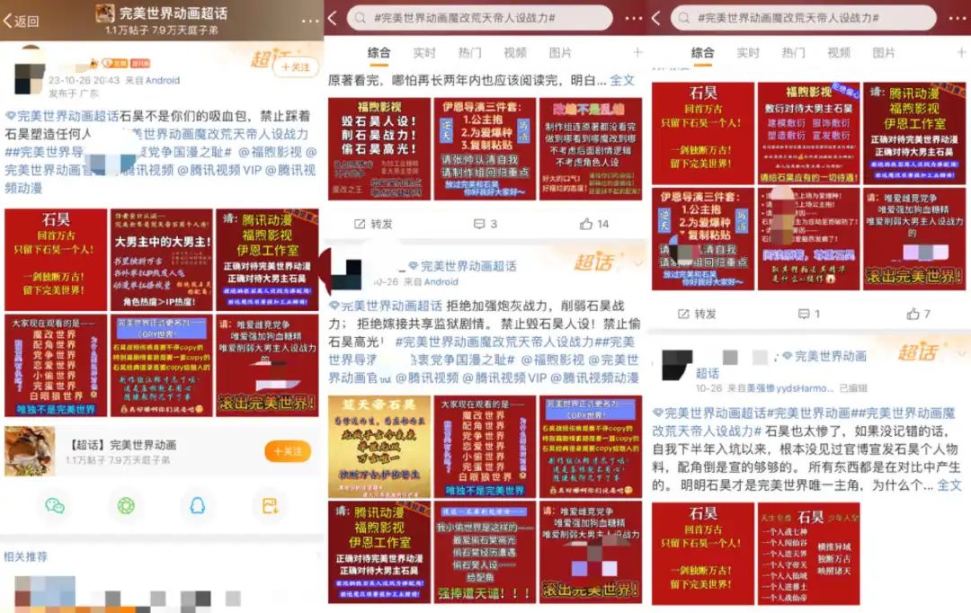 毫不奇怪,《完美世界》官方动画、制作人腾讯视频动画、制作人福暖影视成为粉丝愤怒的发泄目标。尤其是2023-2024年初,@完美世界动画官微 被骂关掉了微博评论区,粉丝们曾经轮流分享80万。 前所未有的盛况,只是为了给自己喜欢的角色提供支持和讨论。粉丝的高频维权逐渐涉及到动画制作、线上线下活动等各个环节,甚至开始恶意中伤导演和创作者。官方态度也无能为力,从配合粉丝的合理需求,到无理取闹。