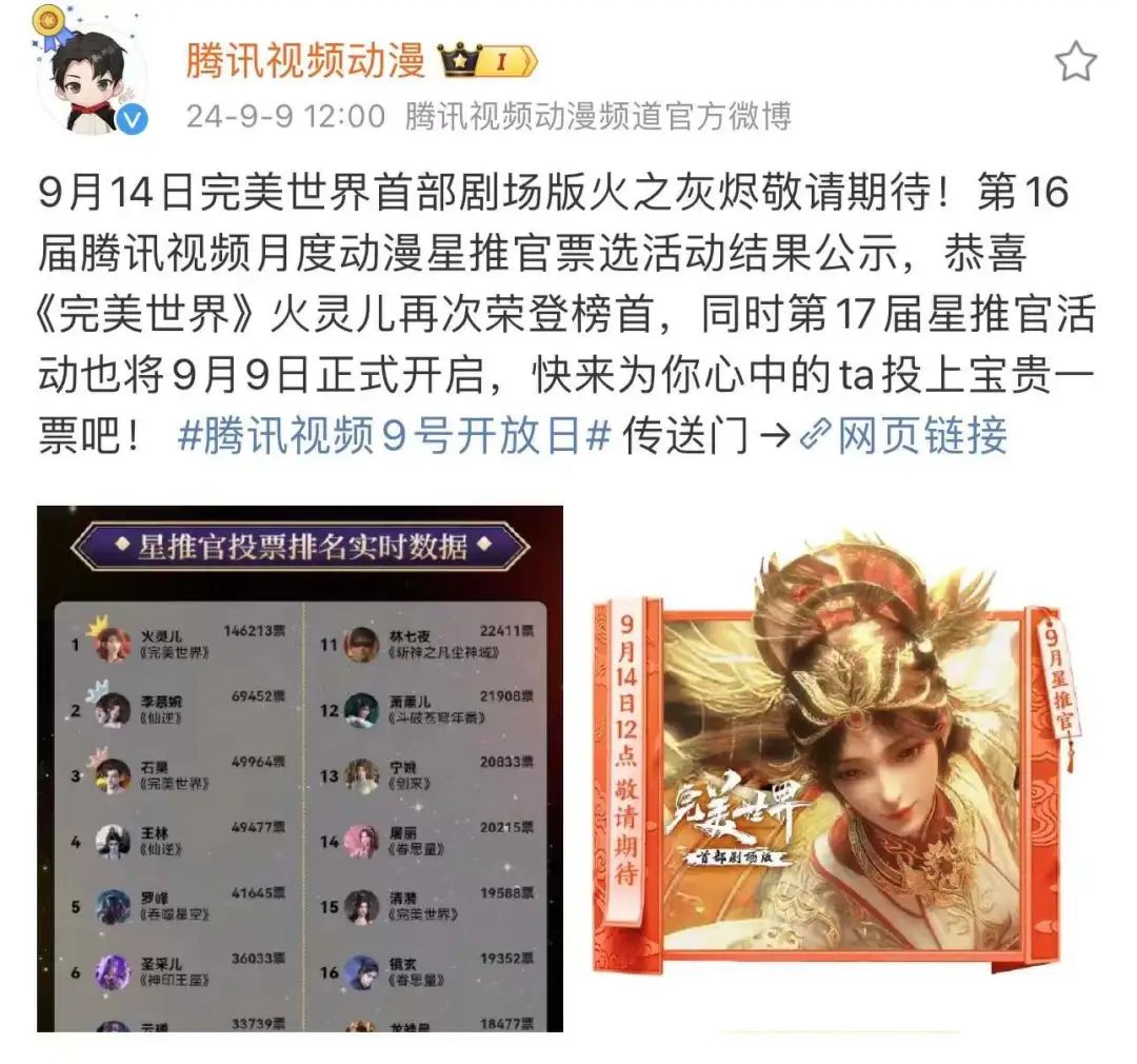 本来就有饭圈化的趋势和争议性的内容,各动画官方账号在实际运营活动的实施中也不太注重细节。比如在《完美世界》动画三周年特别点映会上,三个主要女性角色错过了一个。对于操作来说,可能只是选择了一张图片,但对粉丝来说确实是一个严重的伤害。