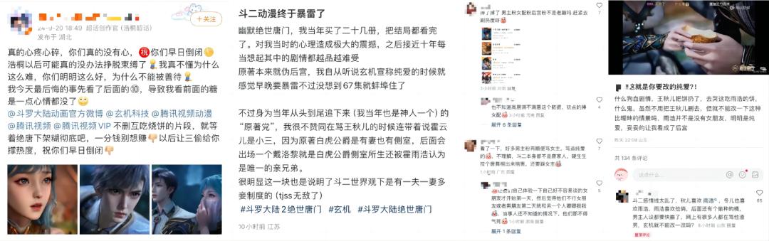 作为一名“法官”,每个动画官员最喜欢的就是沉默,没有回应。比如在2022-2023周期,包括@完美世界动画官方微 @多个热门年番的评论区,如斗罗大陆,长期关闭,官方的“我不听”导致了粉丝群体在遇到问题时的逆反性发泄——刷分享、爆超话、社会媒体差评,甚至通过各种渠道直接举报作品。