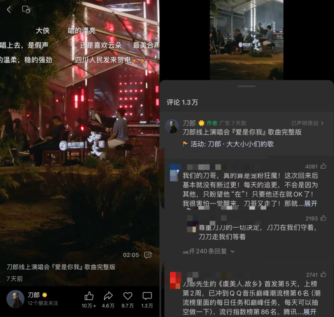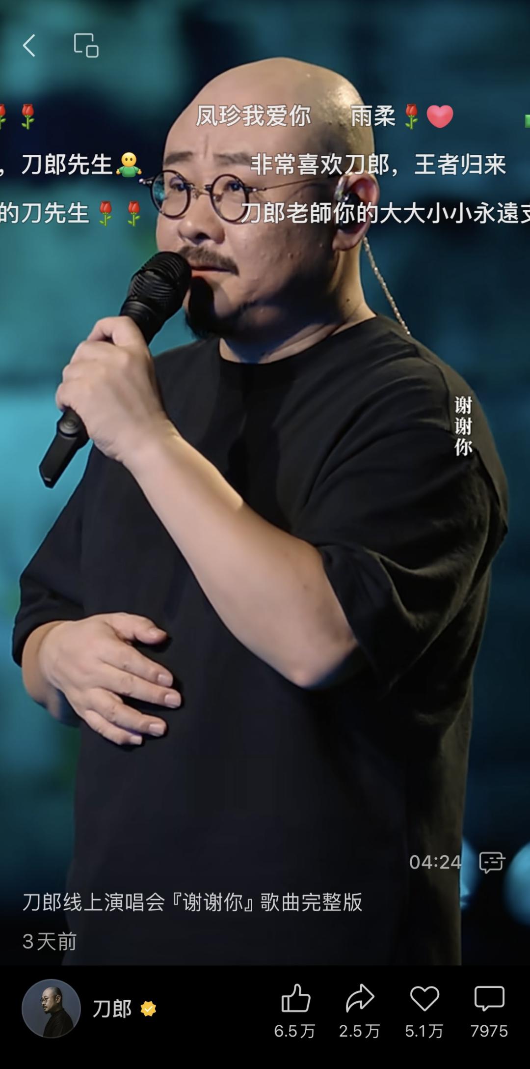 此前,崔健、西城男孩、罗大佑等知名歌手都在视频号上切入了线上演唱会,这也带动了一批集体怀旧情绪,但与刀郎的表演相比,声音还是略低。很多网友感叹“其他人都看了,只有刀郎看完了。”、还以为刀郎是视频号开演唱会的第一人。