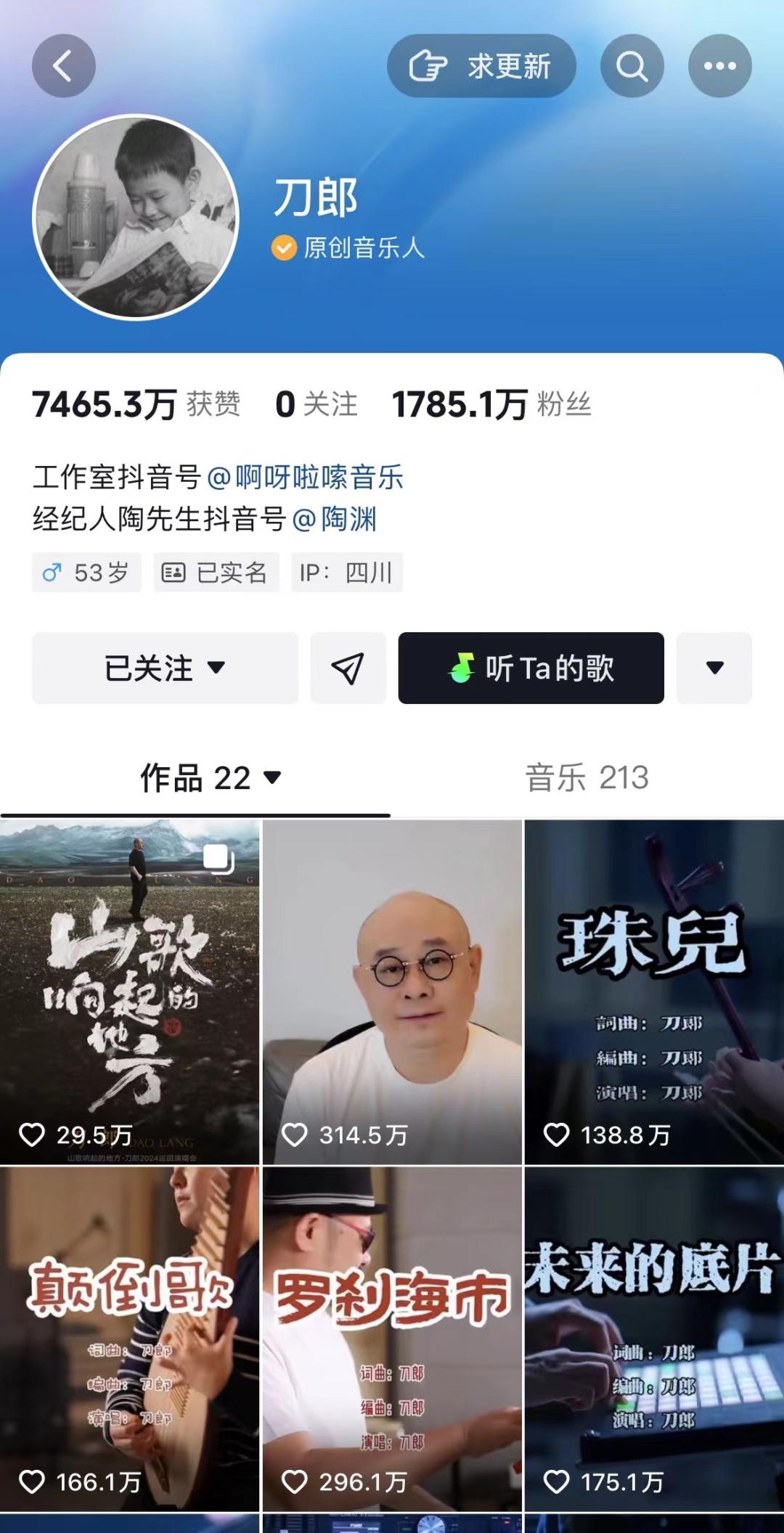 去年《罗刹海市》走红后,刀郎顺势进入抖音,开始频繁发布音乐视频,包括《2002年的第一场雪》《驼铃》等知名老歌。目前已经积累了1765万粉丝,平均每部作品都有500万左右的好评,很多作品评论超过100万。