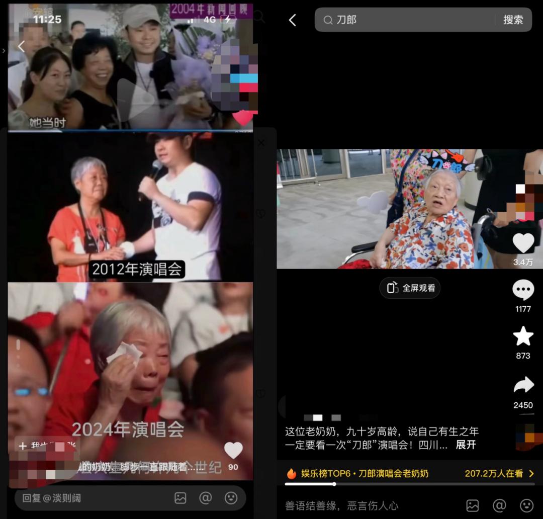 在现场,一位87岁的钻石粉奶奶泪流满面,给无数人留下了深刻的印象。#刀郎演唱会奶奶登上T0P49Tok娱乐榜。另一位90岁的老奶奶坐在轮椅上,戴着刀郎支援灯,出现在成都演唱会现场。