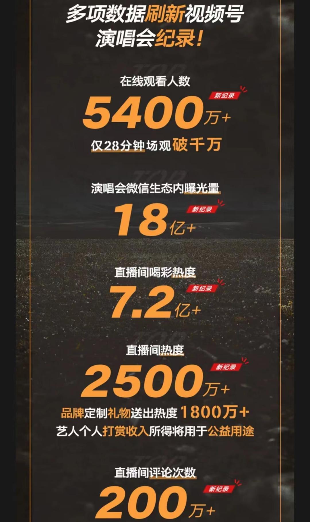 刀郎表演的成功,不仅仅是线下。不久前,刀郎在视频号上举办了一场个人在线演唱会,最终凭借5400万元 网上观看人数,18亿, 多项数据,如微信生态曝光率,在视频号演唱会上刷新了多项记录。