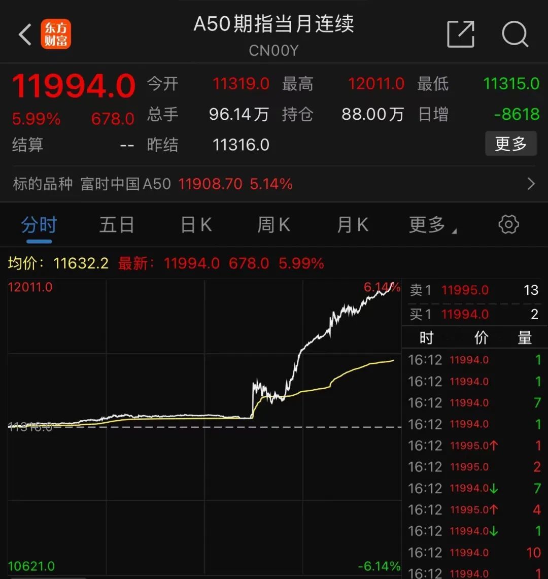 收盘后,A50期货指数继续猛拉,截至发稿时已上涨近6%。