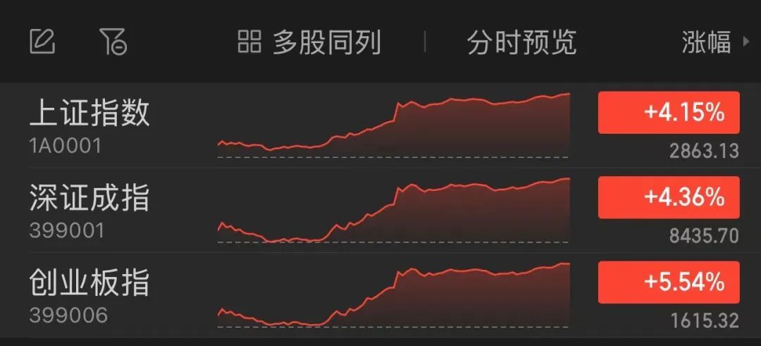 今天,在多项利好的刺激下,a股全线大幅上涨,各大股指均涨幅超过4%。上证指数单日暴涨超过100点,收复2800点。深证指数一举突破8200点、8300点、8400点的整数关口。 两市近5000只股票上涨,涨停超过100只股票或涨幅超过10%,成交量大幅放大至9744亿元,创下4个多月至今最大成交。