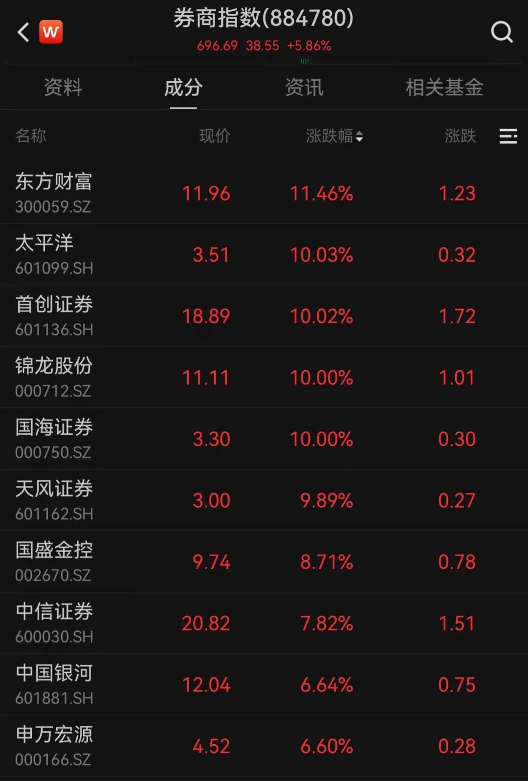 券商股也集体上涨,板块指数大幅上涨5.86%,创下5个月以来最大涨幅。成交额从昨天的106亿元飙升至496亿元,增幅高达368%。交易股全部上涨,太平洋、首创证券、国海证券等强势涨停。