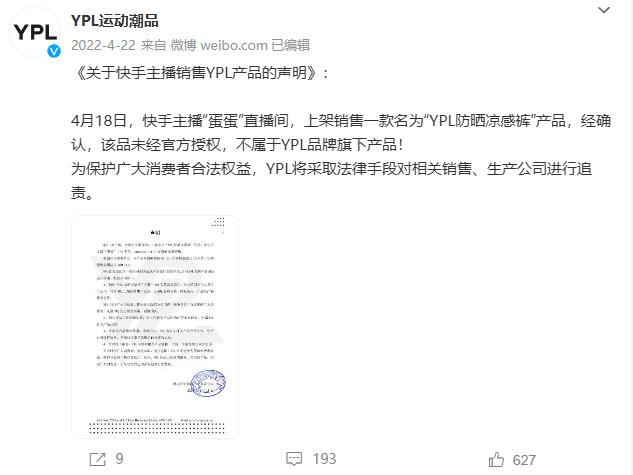 过了几天,@YPL运动潮产品 微博帐号发文称,蛋蛋直播间出售「YPL防晒凉感裤」,未经官方授权,不属于YPL品牌的产品。