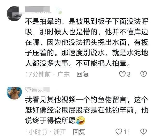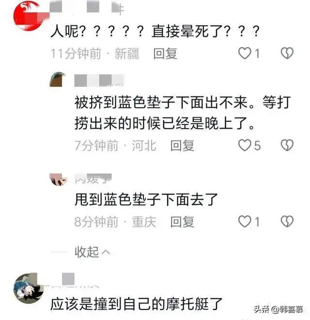 每个人对这个人消失的原因都有不同的看法。根据网友的猜测,这个人很可能被扔到浮板下,导致他无法呼吸,所以他无法把头伸出来呼吸。另一种可能是,当他漂移时,摩托艇撞上了他,身体受伤,然后在水中失去了观念,导致溺水。
