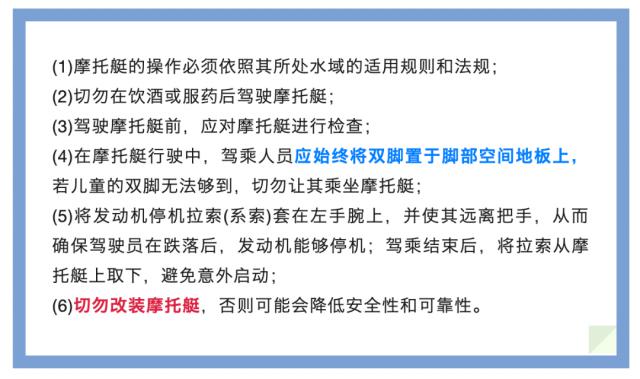 1、救生服:驾驶员和乘客必须穿正式允许的救生服,并适用于个人摩托艇。 ( PFD ) 。