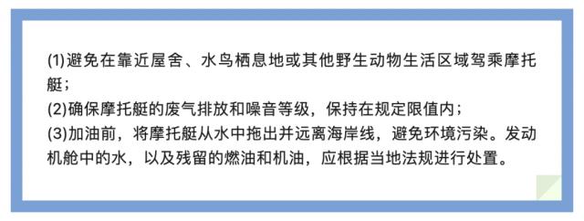 3、驾驶护具:操作摩托艇时,建议佩戴手套和防护鞋。另外,建议佩戴护眼设备,避免风, 水和阳光对眼睛有害。