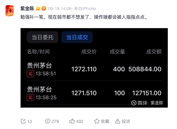 著名小说家紫金陈于9月18日在雪球上发布消息,显示他购买了500股贵州茅台。交易账单显示,紫金陈的加仓费用超过63万元。此前,6月11日,他还在社交平台上宣布增加了贵州茅台300股,表达了对贵州茅台三五年业绩提升的信心。