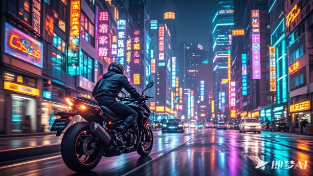提示词 " 在路上快速行驶的摩托车,街景迅速倒退。 "