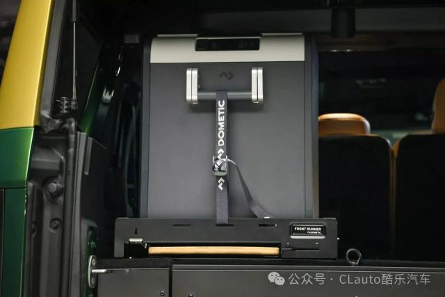 内饰部分,座椅采用棕色和黑色 Katzkin 皮革又包起来了,车里还加了一个。 Dometic 12 伏冰箱 / 冰柜,以及一张可以下拉的尾门桌和货物抽屉。