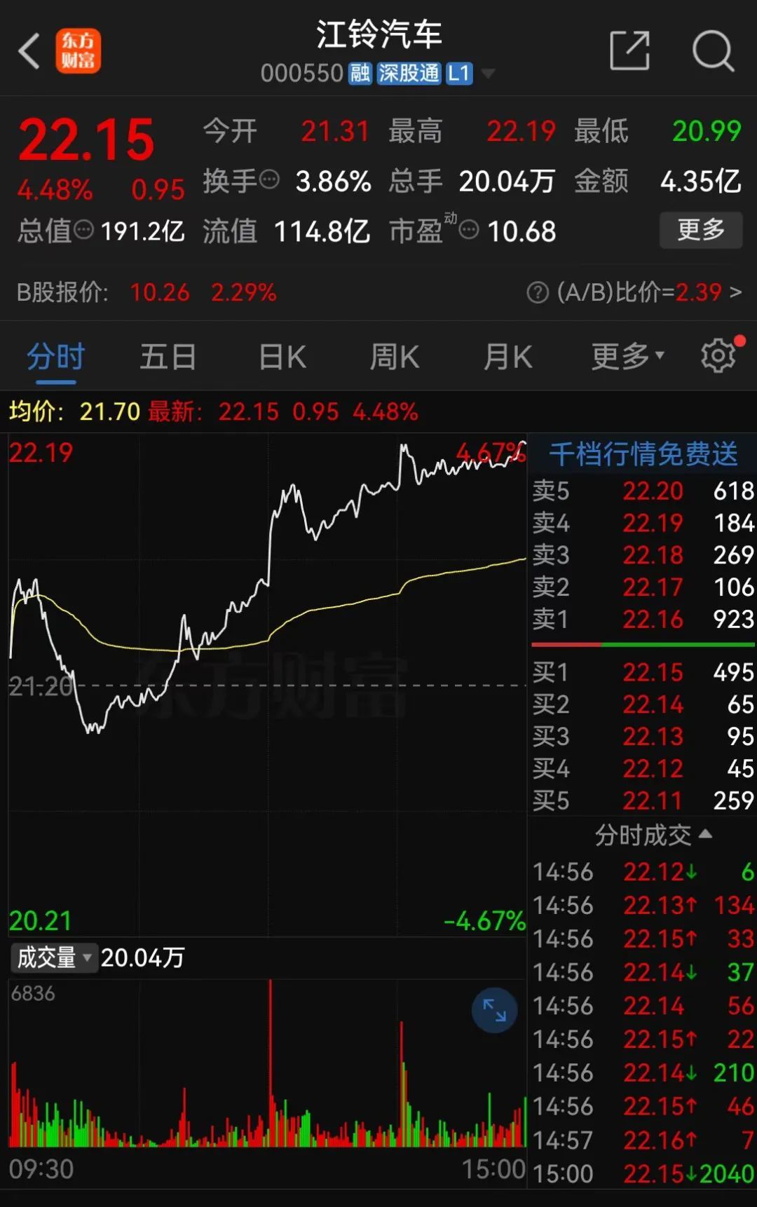 江铃车辆总市值为191.2亿元,截至9月24日收盘。